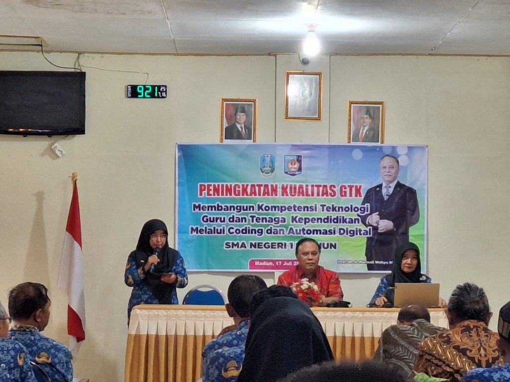 Madiun, 17 Juli 2025 — Dalam upaya meningkatkan mutu sumber daya manusia di lingkungan sekolah, SMA Negeri 1 Madiun menggelar kegiatan bertajuk “Peningkatan Kualitas GTK: Membangun Kompetensi Teknologi Guru dan Tenaga Kependidikan Melalui Coding dan Automasi Digital.” Kegiatan ini menyasar seluruh Guru dan Tenaga Kependidikan (GTK) dengan tujuan memperkuat literasi digital dan keterampilan abad ke-21 yang sangat relevan dalam era transformasi pendidikan saat ini.